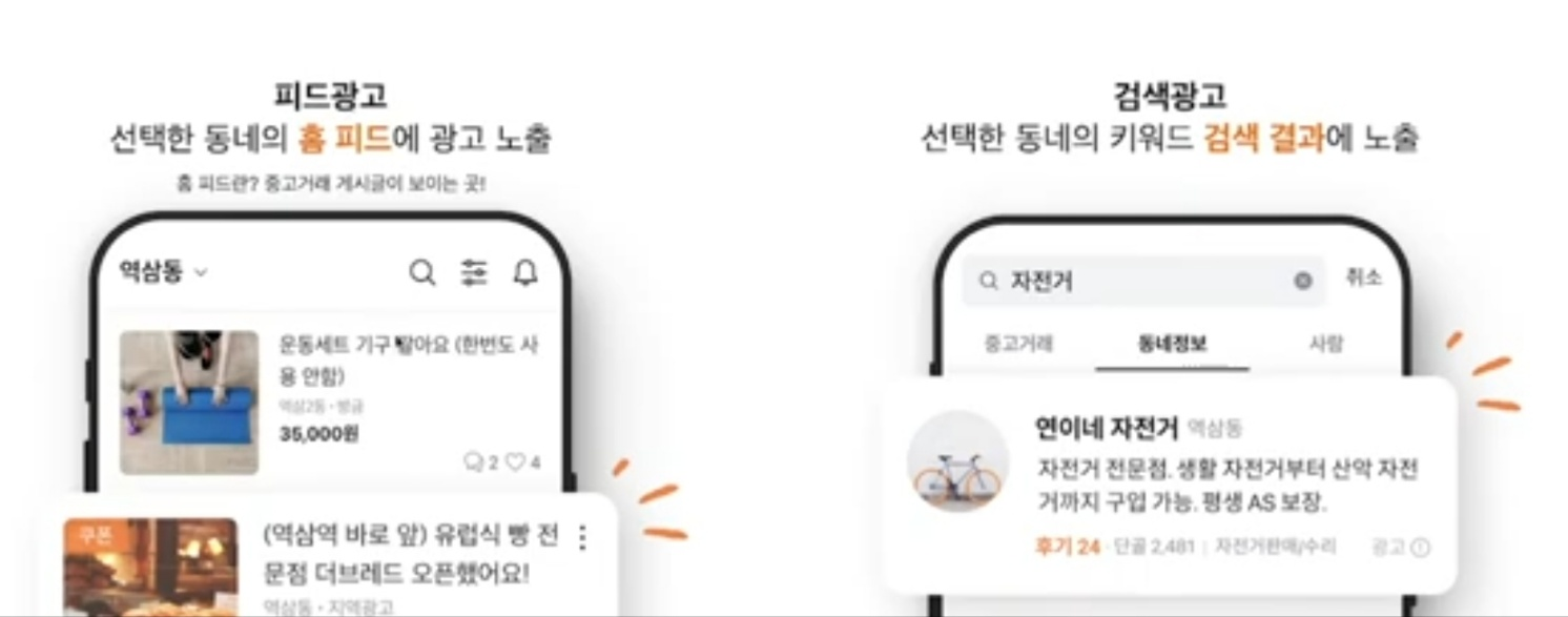 당근마켓 광고는 어디에서 보이는 것, 어디에서 노출이 되는 것에 따라 두 가지로 나뉜다고 합니다.