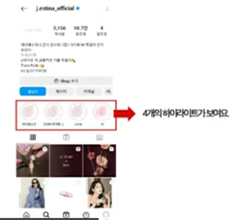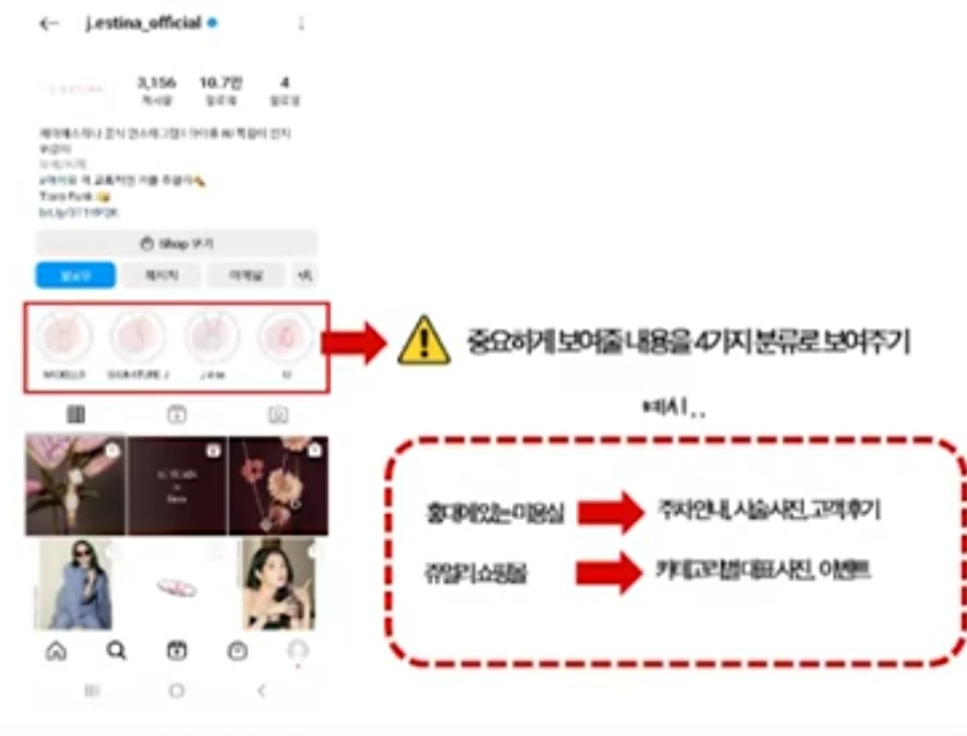 스토리 하이라이트 .비즈니스 계정에 들어가 보면 스토리 하이라이트이라고 해서 프로필피드 사이에 동그라미로 표시된 것이 있다고 합니다. 동그라미로 보이는 것이 스토리 하이라이트 설정이라고 합니다. 이걸 꼭 활용해야 한다고 합니다. 활용해야 하는 이유는 인스타그램 플랫폼 특성상 검색기능이 없다고 합니다. 검색 기능이 없다는 의미는 계정에 들어와서 오래전에 본 것을 찾고 싶은데 찾을 수가 없다고 합니다. 인스타그램은 상대방이 올린 피드가 시간 순으로 누적돼서 쌓이는 구조로 카테고리별 분류할 수 있는 기능도 없고 시간 순으로 누적되는 방식으로 요즘 피드를 고정시키는 기능이 생겼다고는 하지만 고정적으로 언제 들어오든지 언제나 볼 수 있는 방법은 스토리 하이라이트 밖에 없었다고 합니다. 하루에도 여러 개의 피드를 올리게 된다면 중요한 공지해야 하는 내용이나 강조해야 하는 내용들을 찾으려면 계속 내려가야 한다고 합니다. 그럴 때 스토리하이라이트를 활용해서 중요한 내용을 시간에 관계없이 항상 상단에 고정을 할 수 있다고 합니다. 하이라이트는 처음 보이는 화면에서 프로필 영역과 피드 사이에 총 4개의 동그라미로 보인다고 합니다. 옆으로 드래그를 하면 추가로 더 볼 수는 있지만 처음에는 4개만 보인다고 합니다. 비즈니스에서 가장 먼저 보여주고 싶은 내용 4가지를 정리해서 보여주면 된다고 합니다. 스토리하이라이트를 일종의 웹사이트를 메뉴라고 생각하면 편하다고 합니다. 일반기업의 웹사이트 메뉴를 살펴보면 회사소개, 브랜드 소개, 제품소개, 찾아오시는 길이 있듯이 스토리하이라이트를 이와 같이 활용하면 좋다고 합니다. 예를 들어 스토리 하이라이트에 미용실이면 주차안내, 시술사진, 영업시간, 고객후기를 볼 수 있게 하거나, 쇼핑몰이라면 카테고리 별 대표사진, 이벤트 등을 보여 주면 된다고 합니다.