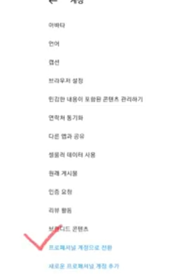 설정→ 계정 → 프로페셔널 계정 전환 → 카테고리 선택 → 크리에이터와 비즈니스 중 선택