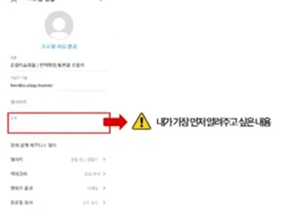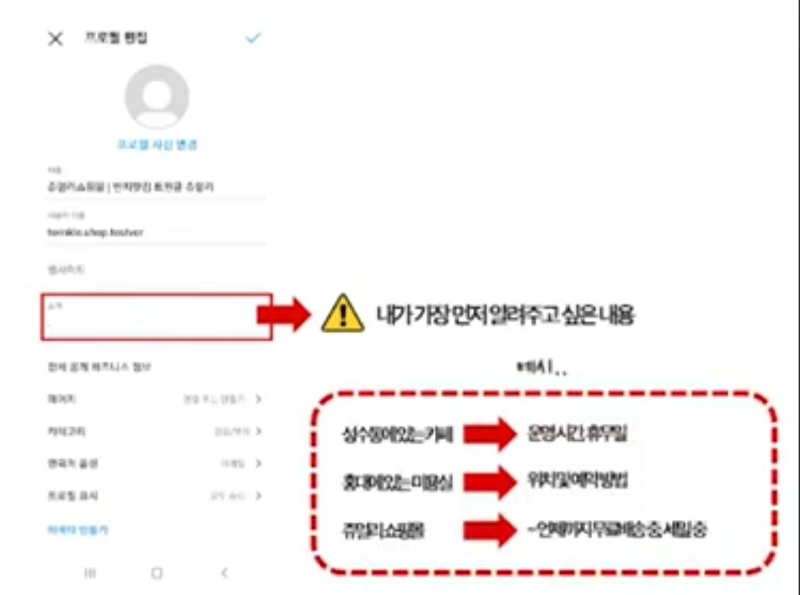 프로필 사진. 프로필 사진 선택을 할 때에는 로고를 넣지 않아도 된다고 합니다. 로고 안 넣은 것이 더 나을 때도 있다고 합니다. 프로필 사진이 보이는 영역을 살펴보면 작아서 잘 보이지도 않는다고 합니다. 댓글 남기면 누가 댓글 남겼는지 살펴볼 때 왼쪽에 작은 이미지로 보이고 스토리 올렸을 때 그 사람의 피드에 우리 스토리가 올라 왔다는 표시될 때 프로필 사진이 보인다고 합니다. 프로필 사진에 로고를 넣기도 하지만 홍보하고자 하는 제품의 사진을 넣어도 된다고 합니다. 로고나 브랜드명, 상호 같은 것을 꼭 기재해야 하는 경우는 인스타그램으로 회원관리 및 공지를 하는 경우라면 로고나 상호 명을 꼭 넣어줘야 한다고 합니다. 예를 들어 반찬을 만들어 파는 반찬가게의 경우에는 매일 파는 반찬의 사진과 함께 주문마감이나 휴무 같은 공지 같은 것을 띄우는 경우라면 구매자가 스토리에 새로운 반찬 사진이나 공지가 올려오면 바로 클릭을 해서 확인을 하는 경우가 많다고 합니다. 이 경우에는 구매자가 내가 구매하는 가게라는 것을 정확히 알 수 있는 가게 이름이나 로고를 프로필 사진으로 등록하는 것이 좋다고 합니다. 로고가 없다면 흰 바탕에 텍스트로 작성해도 상관은 없다고 합니다. 중요한 것은 공지를 하는 업체가 어디인지를 알게 하는 것이 더 중요하다고 합니다. 이런 경우가 아닐 경우에는 브랜드를 설명할 수 있는 이미지를 넣으면 된다고 합니다. 프로필 사진에 텍스트를 넣는 경우라면 이미지 선택할 때 프로필 영역은 원형으로 선택이 되니 글자를 넣을 때에는 원 안에 글자가 잘 들어갈 수 있도록 조절을 잘 해주면 된다고 합니다.