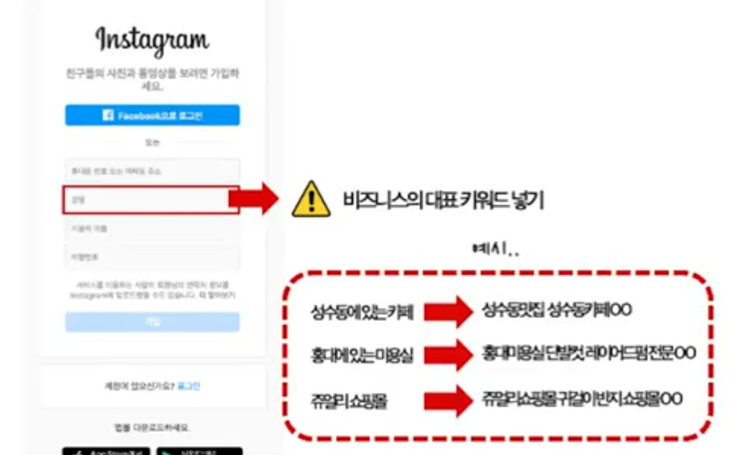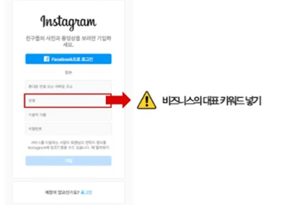 첫 번째로 해야 할 일은 계정 변경이나 회원 가입을 해야 하는데 회원가입 시 고려해야 할 점들이 있다고 합니다. 성명에 본인의 이름 실명을 적는 것이 아니라 비즈니스 대표 키워드를 넣어야 한다고 합니다. 프로필 이름은 검색에 영향을 끼치기 때문이라고 합니다. 인스타를 하는 이유는 홍보를 위해서인데 그러기 위해서는 이용자들이 홍보하는 업체를 찾기 쉽게 만들어줘야 한다고 합니다. 예를 들어 홍대에서 미용실을 운영 중이고 단발로 머리를 잘 잘라서 단발자라는 상호 명을 하고 있다고 합니다. 그렇다고 인스타그램의 성명에 단발자로 입력을 하면 안 된다고 합니다. 그 이유는 인스타그램에서 사람들이 검색을 할 때에는 홍대미용실로 검색을 하는 경우가 많다고 합니다. 그렇기 때문에 성명에는 위치한 곳의 장소 예를 들어 성수동맛집 성수당카페00, 홍대미용실단발컷레이어드펌전문00, 쥬얼리쇼핑몰귀걸이쇼핑몰00과 같은 식으로 비즈니스의 대표 키워드를 넣은 성명을 작성해야 한다고 합니다. 성명은 한 번 설정하면 14일 동안 바꾸지는 못하지만 그 기간이 지나면 이름을 변경할 수 있다고 합니다.