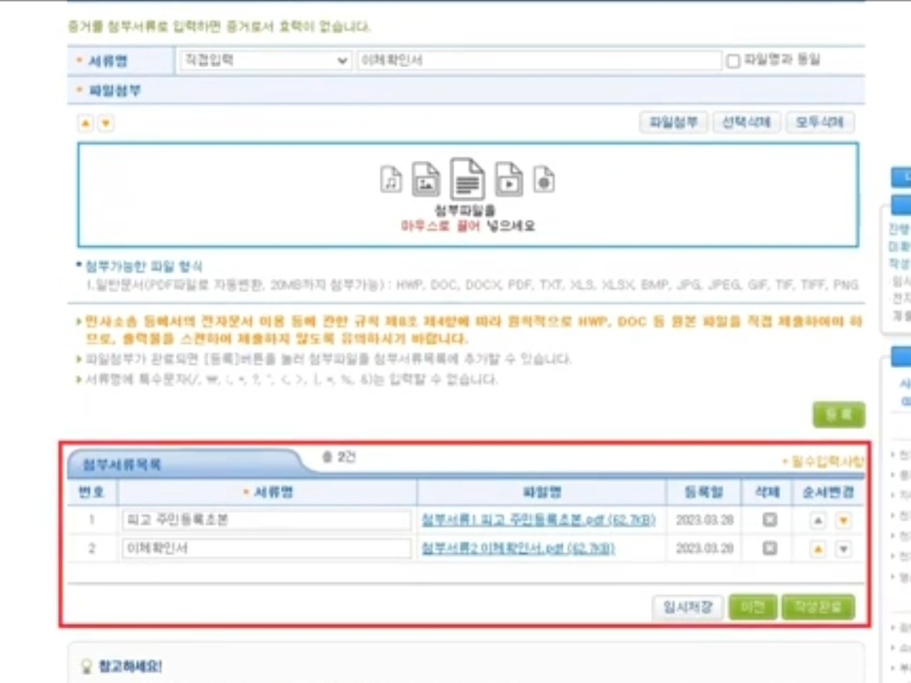 하단의 첨부서류 목록에서 내가 첨부한 서류들이 순서에 맞게 첨부되었는지 확인해야 한다고 합니다. 만일 순서를 변경해야 한다면 우측에 순서변경 화살표를 눌러 순서를 변경 할 수 있다고 합니다. 그리고 작성완료 버튼을 눌러 파일 첨부를 마무리 하면 된다고 합니다.