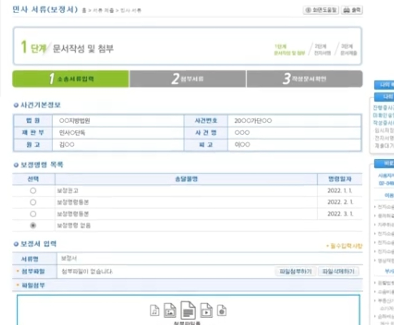 세 번째, 서류를 제출할 사건을 확인하기 위해서 진행 중인 사건의 법원과 사건번호를 입력해야 한다고 합니다. 문서 작성 및 첨부 단계에서 보정명령 목록을 살펴보면 법원으로부터 송달받은 보정명령 등본들을 살펴볼 수 있다고 합니다.