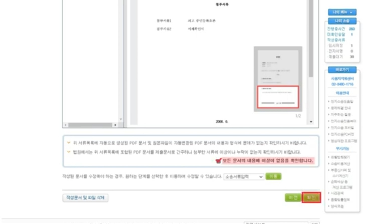 여섯 번째, 작성 문서 확인 단계에서는 서류 목록에 파일명을 클릭하여 해당 파일을 미리 확인해 볼 수 있다고 합니다. 작성한 문서들이 올바르게 작성 및 첨부되었는지 확인하면 된다고 합니다. 첨부된 파일이 모두 올바르게 작성 되었다면 문서내용의 이상 없음에 체크하고 확인 버튼을 눌러 제출 단계로 넘어가면 된다고 합니다.