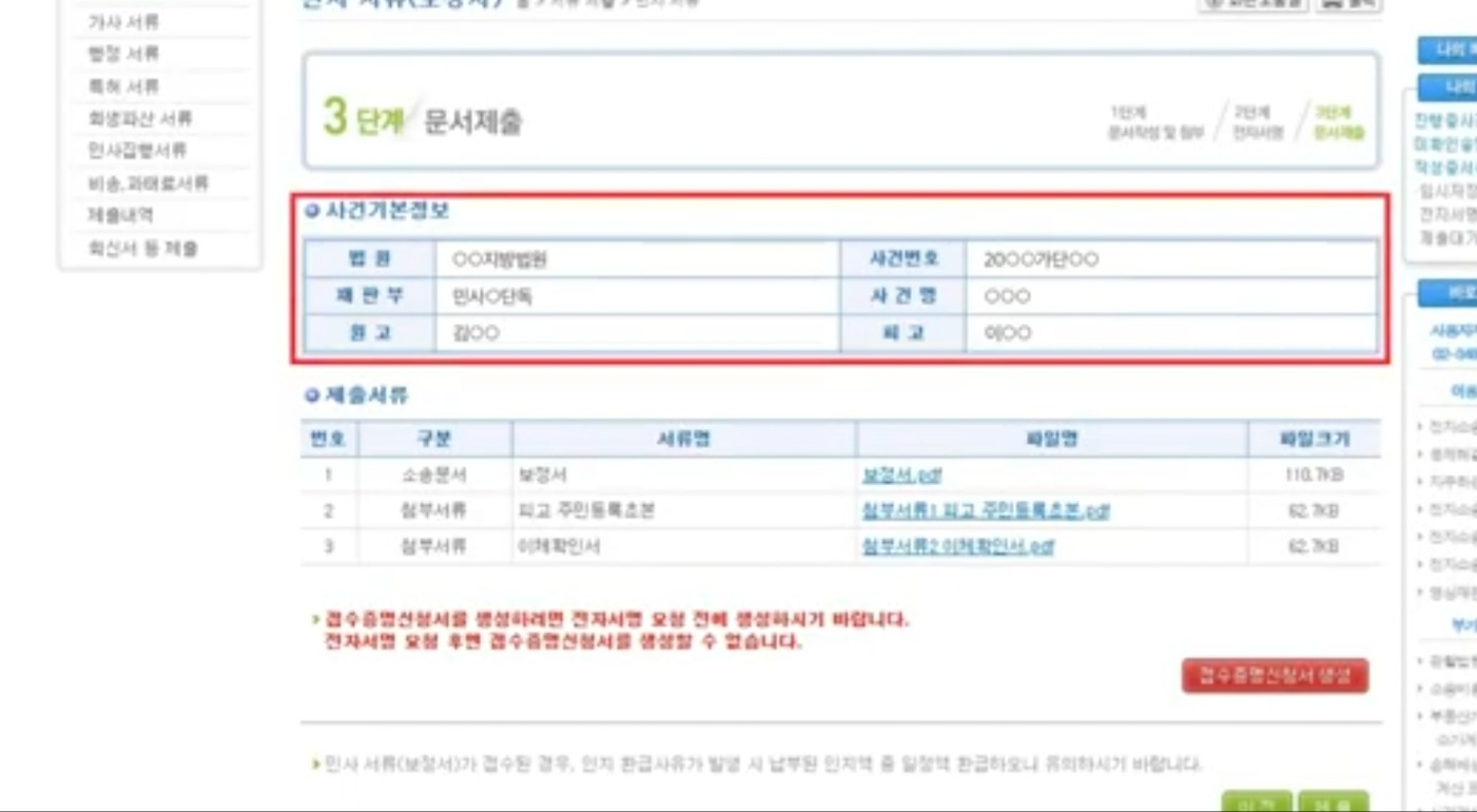 일곱 번째, 문서 제출 단계에서는 보정서를 제출한 사건의 기본정보와 제출할 서류들이 올바른 정보인지 한 번 더 확인한 후 제출하면 된다고 합니다. 그리고 만일 보정서를 제출했다는 접수증명 신청서가 필요하다면 생성버튼을 눌려 한통으로 수정하고 제출버튼을 눌러 발급받을 수 있다고 합니다.