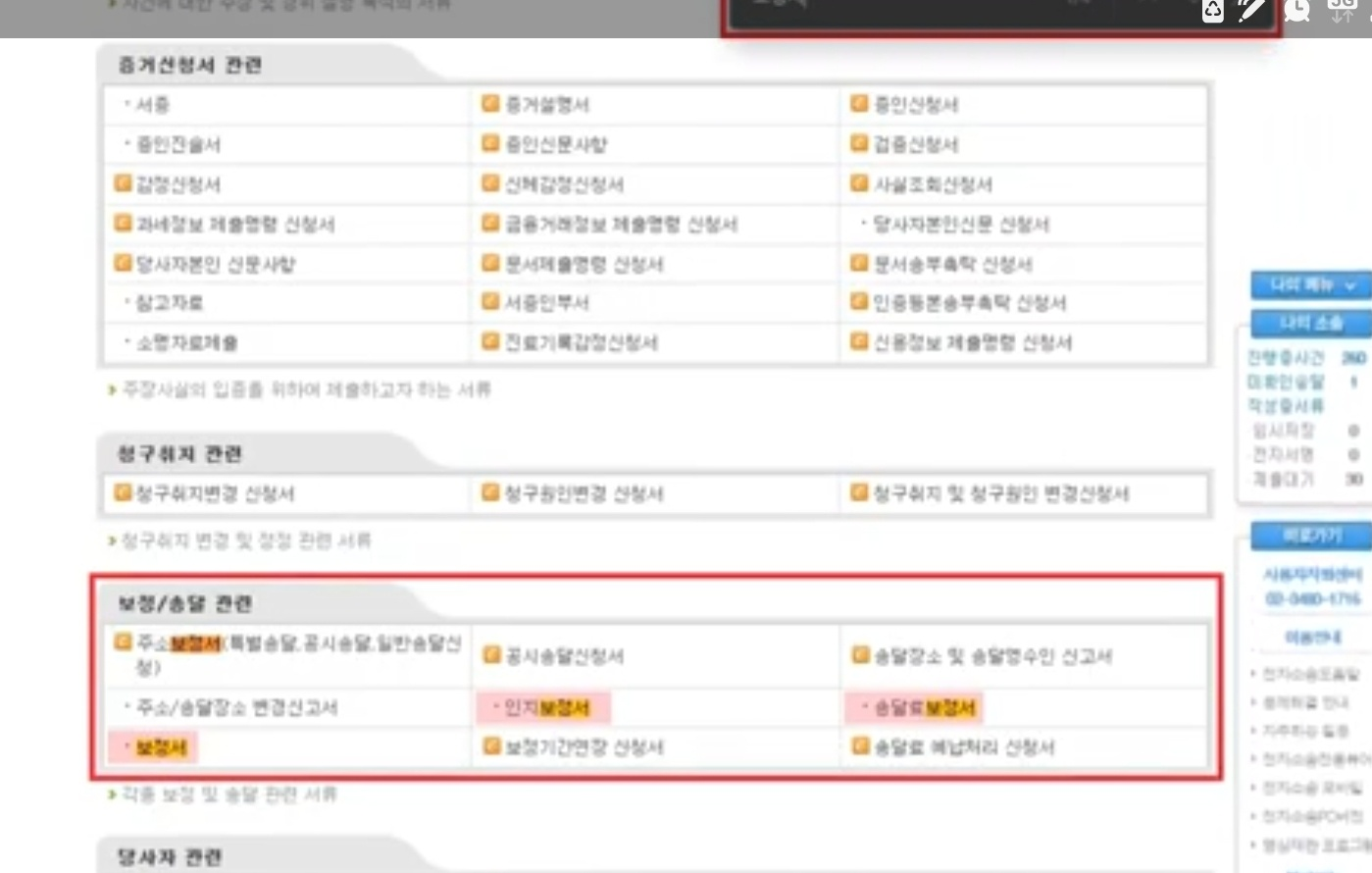 민사본안 항목에서 자주 찾는 민사신청서류를 살펴보면 기본적인 서류들이 상단에 고정되어 있으므로 보정서를 찾아 선택하면 된다고 합니다. 또는 ctrl+f를 누르고 검색어를 입력해서 원하는 소송 서류를 검색해서 선택할 수 있다고 합니다.