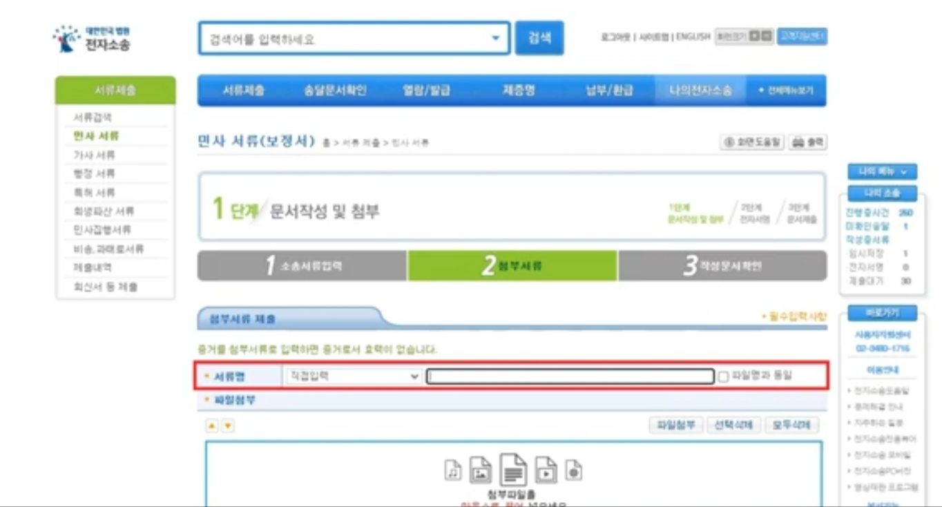 두 번째, 상단 왼쪽에 서류제출에 커서를 갖다 대면 서류제출이 필요한 항목들을 선택할 수 있다고 합니다. 서류제출>민사서류를 눌러 이동.